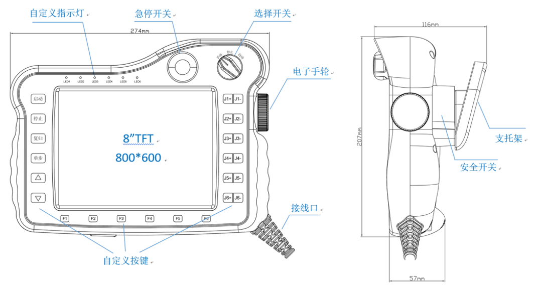 》采用Tl Cortex-A8 32位高性能工業控製處理器,在圖形處理、工業以太網和靈活外設等方麵具有非常突出的優勢。 》專業的人機工程學設計,結構美觀,整體布局和設計充分考慮了人性化,為用戶提供良好的操作體驗; 》按鍵、指示燈可擴展性好,方便用戶自定義; 》方便實現對機器人的手動操作、示教編程、機器人運行等人機對話功能。8inch TFT大屏幕, 提供豐富、清晰的人機交互窗口,提升產品檔次; 》完全自主知識產權設計,軟硬件平台成熟、穩定; 》功能部件齊全,使能開關、觸摸筆等可選配,可以完全滿足不同用戶的應用需求; 》整機工業級設計,可靠性強。